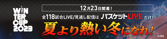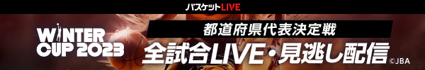 | 12月 1日 | 【ウインターカップ2023 全試合ライブ配信について】 ■期間 12月23日(土)~12月29日(金) ■配信先:バスケットLIVE ■女子1回戦 倉敷翠松(岡山) vs 土浦日大(茨城2) LIVE配信開始時間12.23 12:15~ ■男子1回戦 商大附属(岡山) vs 桐生第一(群馬) LIVE配信開始時間12.24 17:15~ ![]() ※バスケットLIVEには登録、ログイン等の視聴条件があります。 |